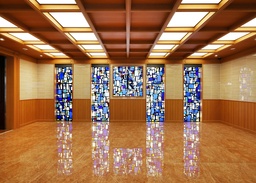 木目調の壁面と端正な天井意匠、重厚感のある石積みの壁材を組み合わせ、上質で落ち着きのあるエントランス空間を創出しました。エントランス中央には華やかなシャンデリアを配し、柔らかな光が訪れる人を優雅に迎え入れます。噴水の水音と景観が重なり、穏やかで落ち着いた雰囲気を醸し出しており、穏やかな時間の始まりを感じさせるエントランスです。
