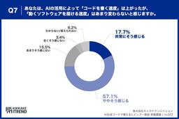 「Q7. あなたは、AIの活用によって「コードを書く速度」は上がったが、「動くソフトウェアを届ける速度」はあまり変わらないと感じますか。」(n=322)と質問したところ、「非常にそう感じる」が17.7%、「ややそう感じる」が57.1%という回答となりました。