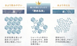 飲める氷は、氷と水の長所を併せ持っています。固体である氷は冷却効果が高い一方で、飲みにくく身体には吸収しづらいです。水は飲みやすい反面、身体への冷却効果が低いです。飲める氷は、氷の冷却力と水の飲みやすさを両立しています。