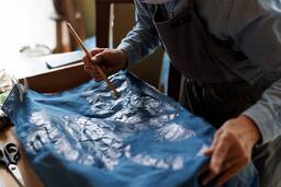 青藍工房は、藍染作家・橋本陽子により1970年に設立されました。 橋本陽子は、化学染料の普及により衰退した藍染を、単なる染色技法としてではなく、「自然・時間・生命の循環」を映し出す芸術表現として再生させることを志し、独自の「藍のろうけつ染」を確立してきました。 徳島で生産される高品質な藍は「阿波藍」と呼ばれ、「ジャパン・ブルー」を象徴する伝統文化として高く評価されています。橋本陽子は50年以上にわたりその可能性を追求し、伝統工芸の枠を超えた芸術として発信し続けています。
