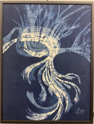 【橋本清子】 青藍工房の系譜を受け継ぐ作家として活動。阿波藍を用いた新たな表現に取り組み、書と染めを融合した立体的な作品を展開。フランスの公募展「ル・サロン」および「サロン・ドートンヌ」に入選し、国際舞台での評価を高めている。