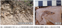 本図幅では、このような地層の情報を解明・整理したことに加え、断層露頭(図2)の発見や周辺の地層との関係の検討を通じて、断層活動の時期や分布の対応関係を明らかにしました(関連論文2)。また、「鳥取県の化石」に選定されている「中新世魚類化石群」についても新たな産地を発見するなど、多様な成果が得られています(図3)。