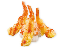 シャリ3貫にエビ天3本を使用した、見た目のインパクトが抜群でボリューム満点の商品です。エビ天を“立てかける”盛り付けにし、エビマヨと赤ユッケダレで全体の味をまとめました。