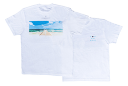 日中のデザインは、青空と海が広がる開放的な風景を表現した「FUSAKI CINEMA SCOPE T-SHIRTS -UMI-」。まっすぐに伸びる桟橋と澄み渡る空、どこまでも続く水平線が織りなす景色が特長です。背面に大胆に配したグラフィックが臨場感を生み、視覚的な広がりと爽やかな印象を与えます。