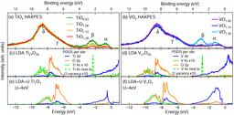 酸素欠損と金属欠損が共存する岩塩型TiOxとVOxの硬X線光電子分光(HAXPES)を計測したところ、図2(a)と(b)に示すように、フェルミ準位(図中のBinding Energyのゼロ)の近くに2つのピークαとβが観測されました。硬X線の偏光ベクトルと光電子の放出方向が平行な場合(Horizontal)と垂直な場合(Vertical)で3d軌道と4s軌道のイオン化断面積が異なることから、αが3d軌道、βが4s軌道に由来することが分かります。