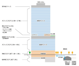 建物は地上29階・地下2階建ての複合ビルで、地下1階から2階に商業ゾーン、3階から9階および11階から27階にはオフィスフロアを整備しています。また、建物の低層部にあたる基壇部最上階となる11階は地域に開かれた空間としての屋上庭園と公共貢献機能を含む複合フロアとなっています。なお、オフィスフロアについては2026年5月より順次入居を開始します。