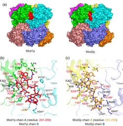図1 Mod1pおよびMod2pの立体構造比較。(a)全体構造。両構造は非常によく類似している。各モノマーは異なる色で示している。 (b) Mod1p(緑)およびMod2p(黄)のモノマー構造の重ね合わせ。(c) Mod1pおよびMod2pのFAD結合部位の比較。Mod1pのa-FADにおけるC2′-OH基(左図赤矢頭)は観察者側を向いているのに対し、Mod2pの標準的なFADにおけるC2′-OH基(右図オレンジ矢頭)は観察者と反対方向を向いている。FADと相互作用する酵素のアミノ酸残基を棒モデルで表示するとともに各残基の名称と番号を示す。点線は水素結合を示す。